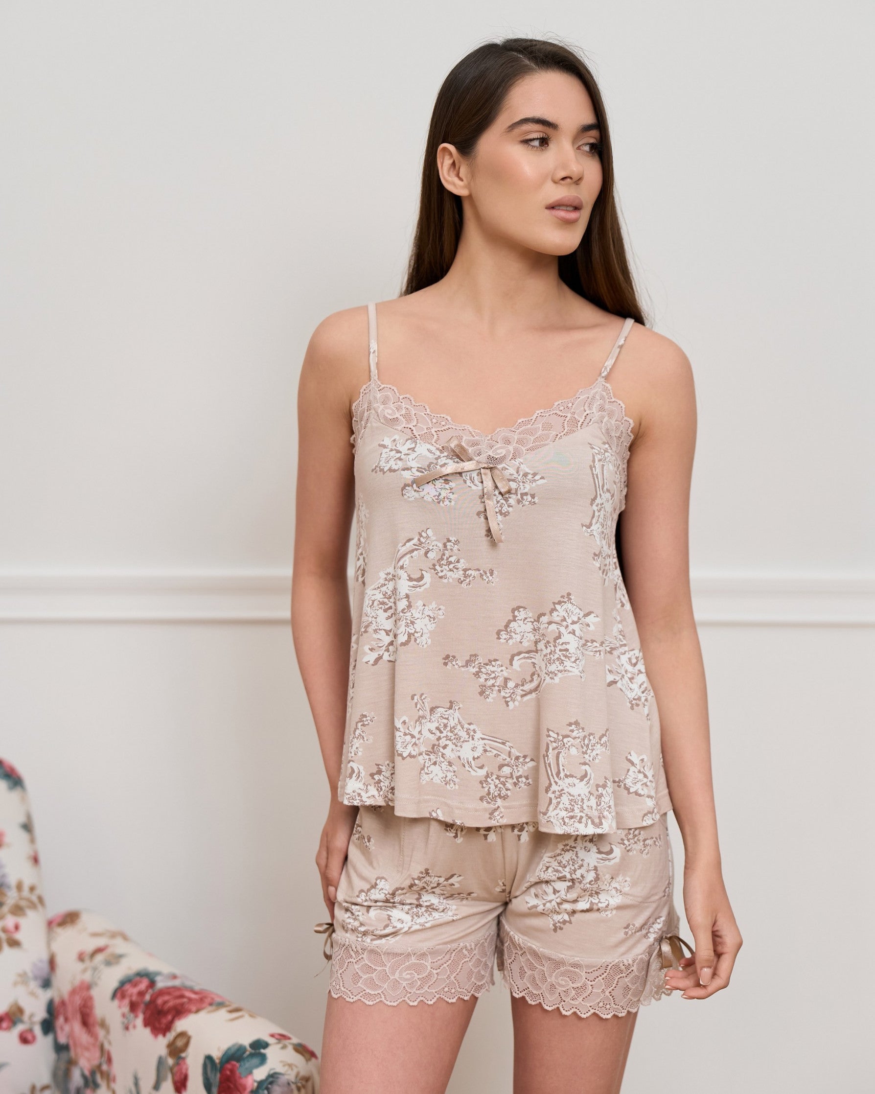 Kogege elegantsi ja mugavuse ideaalset segu selle luksusliku Türgi kaubamärgi NICOLETTE koduriiete komplektiga. Valmistatud pehmest 95% viskoosi ja 5% elastaani segust, tundub see naha vastas sile ja hingav, pakkudes õrnalt venivust täieliku liikumisvabaduse tagamiseks. Toppi ja sobivate lühikeste pükste kombinatsioon loovad kerge ja pingevaba komplekti – ideaalne hubasteks õhtuteks, kosutavaks uneks või mugavateks hommikuteks kodus.